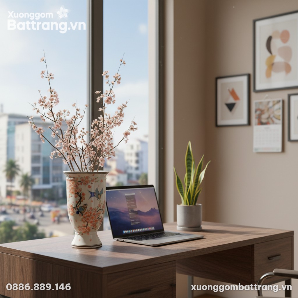 Bình hoa sứ Bát Tràng 30cm trên bàn làm việc gỗ...