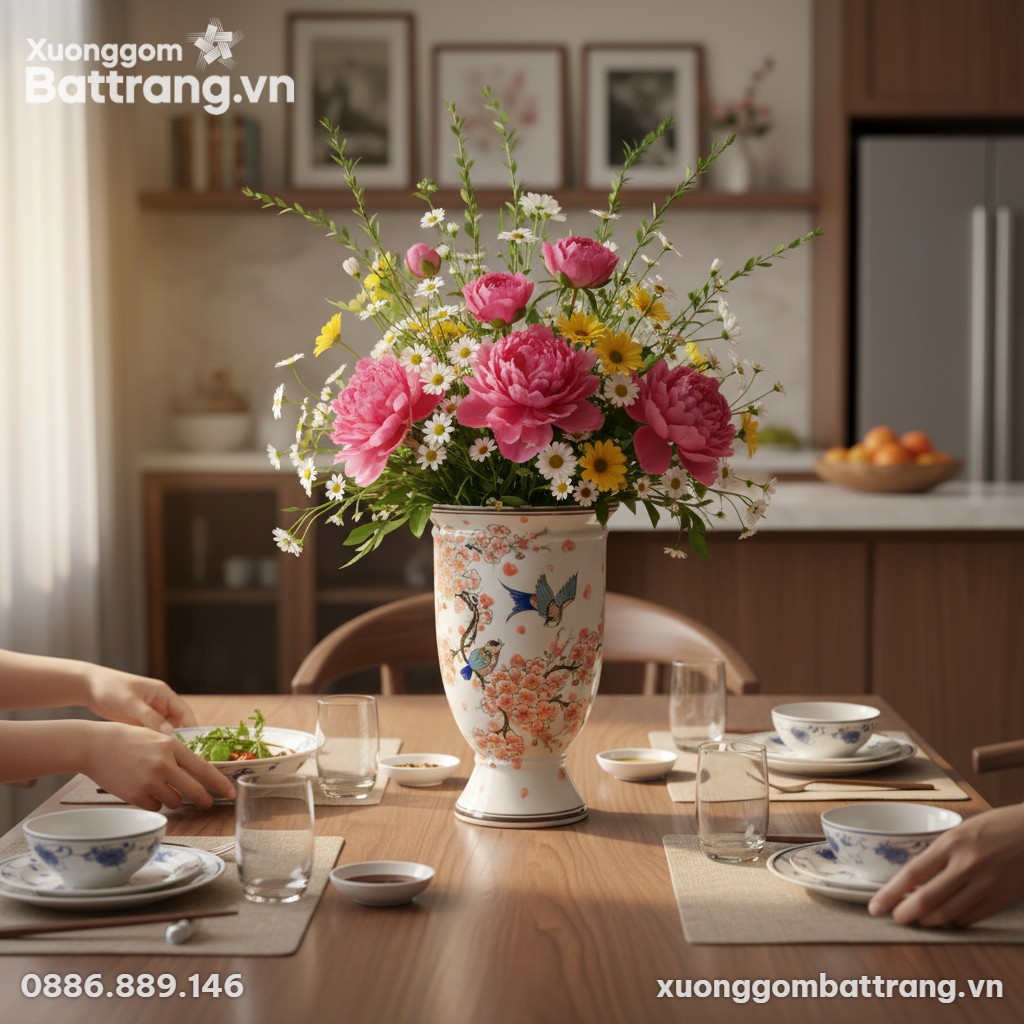 Bình hoa sứ Bát Tràng 30cm làm tâm điểm trên bà...
