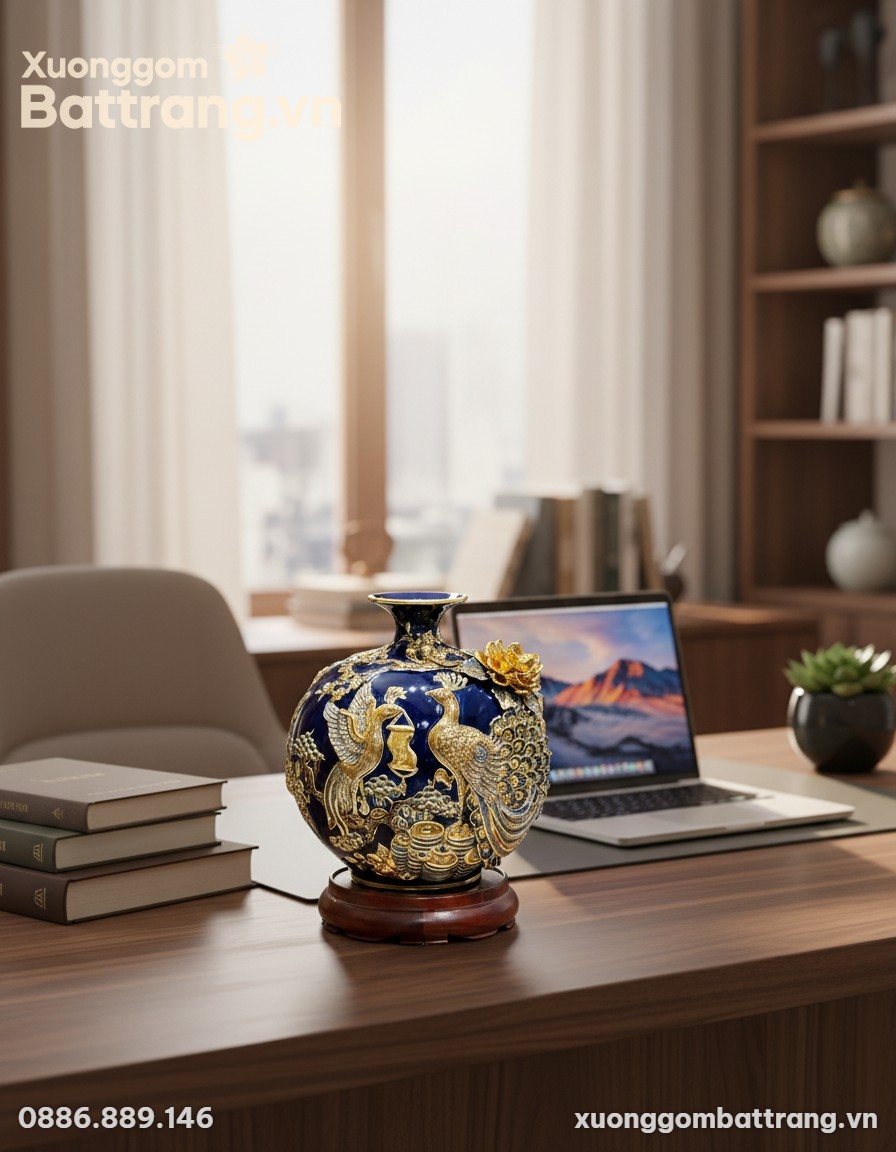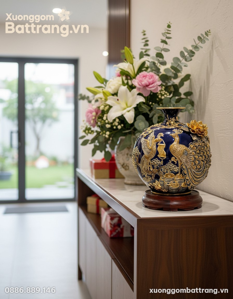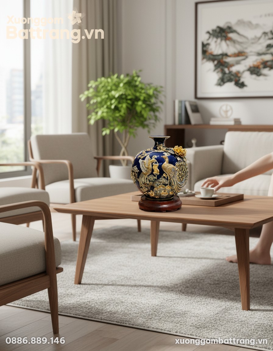 Để tối ưu hóa năng lượng phong thủy và vẻ đẹp sang trọng của Bình hút lộc Công Đào men xanh coban đắp nổi vẽ vàng XG-BHL04, việc lựa chọn vị trí bài trí là vô cùng quan trọng. Sản phẩm này sẽ trở thành tâm điểm thu hút mọi ánh nhìn và vượng khí khi được đặt tại: