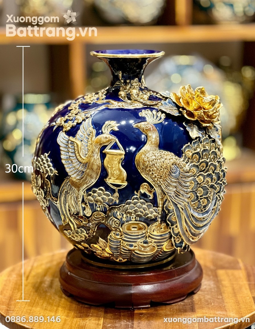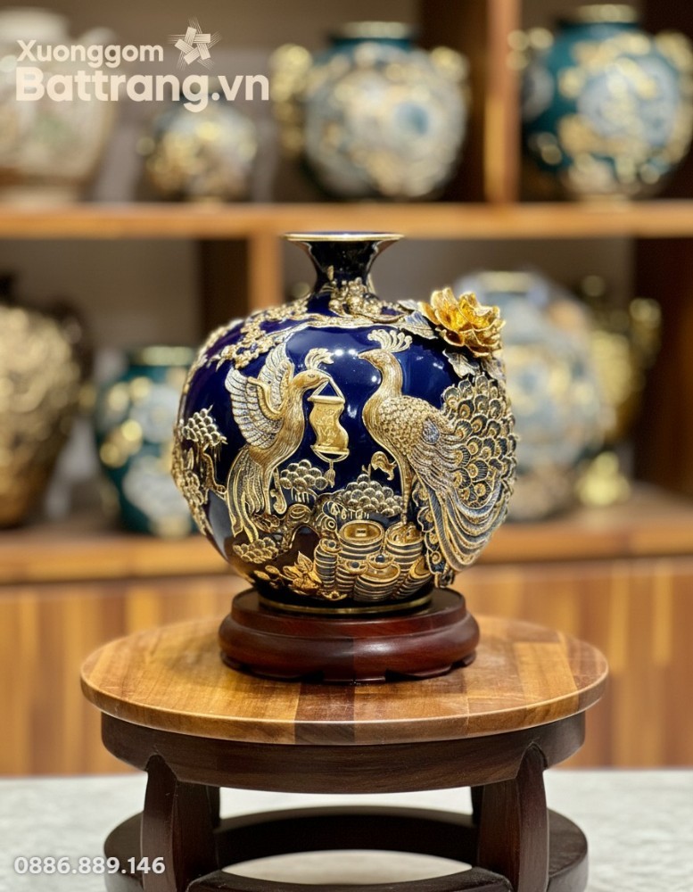 Mỗi chi tiết trên chiếc bình hút lộc này là minh chứng cho trình độ thủ công bậc thầy của các nghệ nhân Xưởng Gốm Bát Tràng. Kỹ thuật đắp nổi tạo nên chiều sâu và sự sống động cho từng đường nét, từ bộ lông chim Công uyển chuyển đến cánh hoa sen thanh thoát. Đặc biệt, việc phủ vẽ vàng 24K không chỉ làm tăng thêm giá trị thẩm mỹ mà còn mang ý nghĩa chiêu tài, hút lộc mạnh mẽ, biến sản phẩm thành một món đồ Bình Hút Lộc Bát Tràng thực sự đáng giá để sưu tầm và trưng bày.