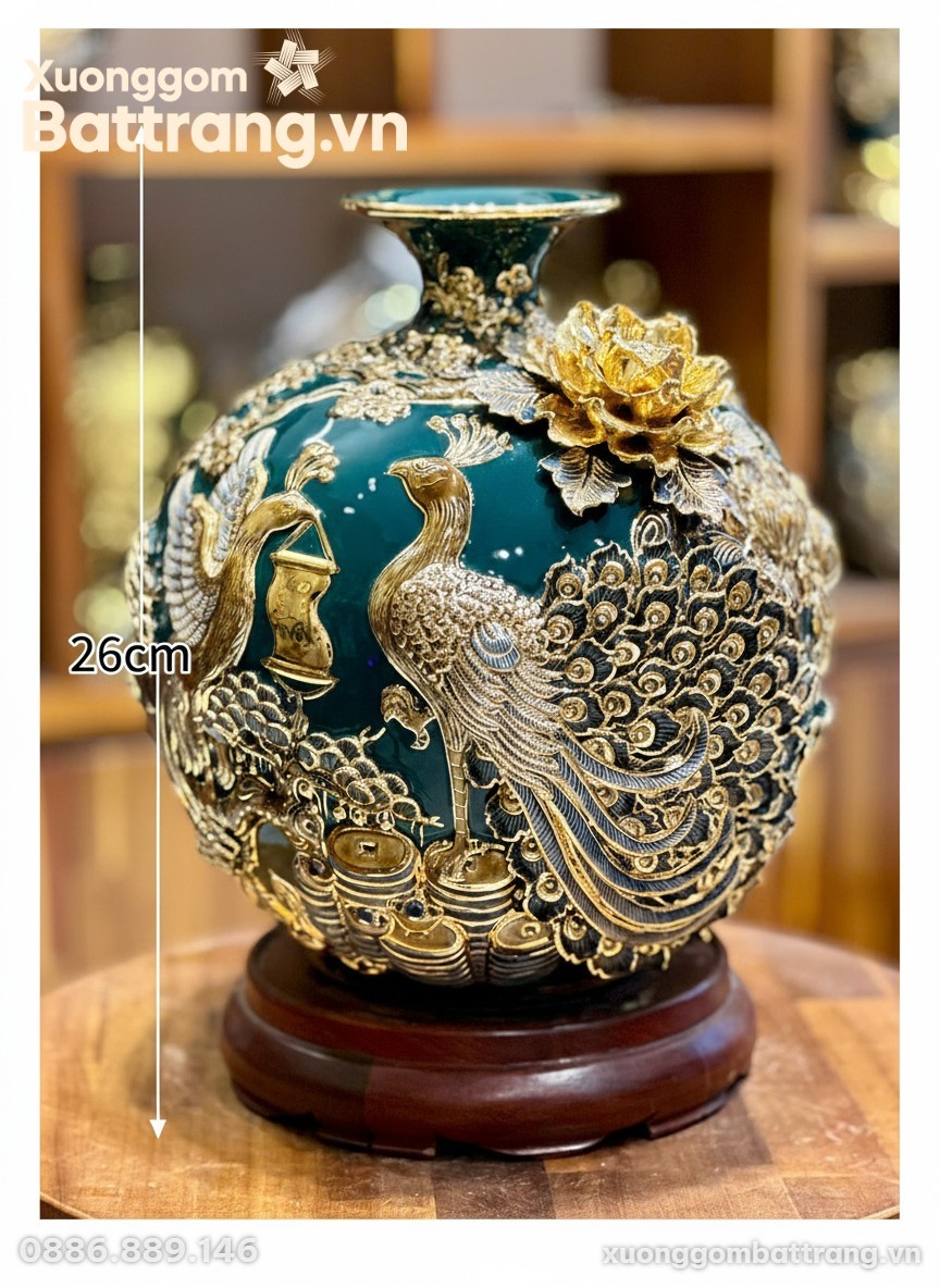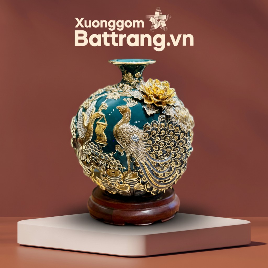 Bình hút lộc Công Đào đắp nổi vẽ vàng men xanh cổ vịt XG-BHL05 là một kiệt tác nghệ thuật độc đáo, kết tinh từ bàn tay tài hoa của nghệ nhân Xưởng Gốm Bát Tràng. Với sắc men xanh cổ vịt trầm mặc, sang trọng cùng những đường nét đắp nổi tinh xảo, vẽ vàng 24K lấp lánh. Sản phẩm là vật phẩm trang trí góp phần thu hút tài lộc và vượng khí cho gia chủ.