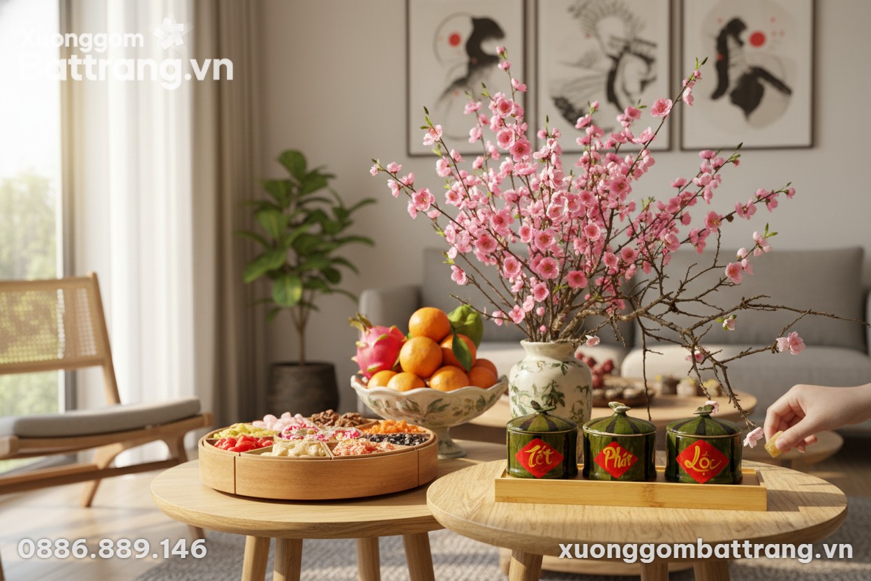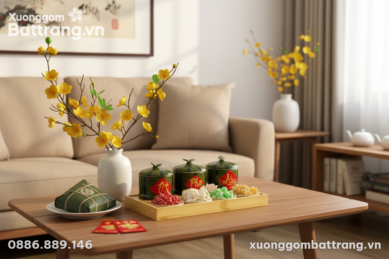 - Bàn Phòng Khách: Là trung tâm của mọi cuộc gặp gỡ, bộ hũ mứt sẽ thu hút mọi ánh nhìn, khơi gợi những câu chuyện vui vẻ và lời chúc phúc đầu năm.