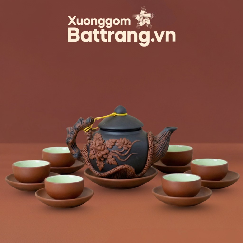 • Màu sắc tự nhiên: Thân ấm và chén sở hữu tông màu nâu đen trầm mặc, kết hợp với hoa văn đắp nổi màu nâu đỏ, tạo nên sự tương phản đầy mê hoặc, gần gũi với vẻ đẹp mộc mạc của đất mẹ.