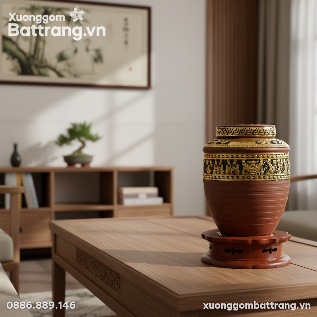 Với vẻ đẹp cổ điển, uy nghi và sang trọng, Chum Ngâm Rượu Khắc Nổi Dát Vàng Hoa Văn Đông Sơn Âu Lạc vừa là nơi ủ rượu quý, vừa là vật phẩm trang trí nội thất đẳng cấp. Sản phẩm phù hợp với nhiều không gian: