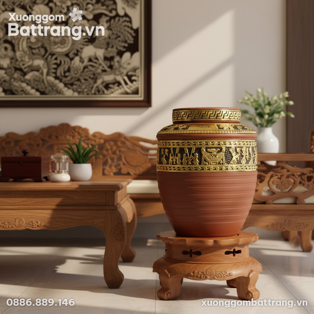 Chum Ngâm Rượu Khắc Nổi Dát Vàng Hoa Văn Đông Sơn Âu Lạc XG-CR03 là một tuyệt tác nghệ thuật, nơi tinh hoa của gốm sứ Bát Tràng hòa quyện cùng dấu ấn lịch sử văn hóa Việt. Mỗi đường nét, mỗi họa tiết trên chum là khúc ca của một nền văn minh rực rỡ, gửi gắm thông điệp về gu thẩm mỹ và đẳng cấp của gia chủ.