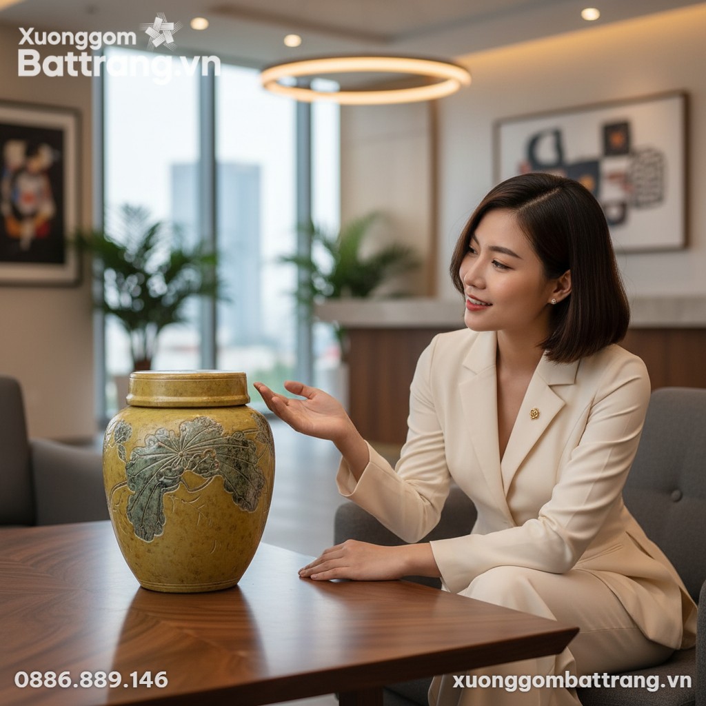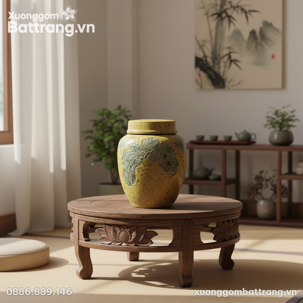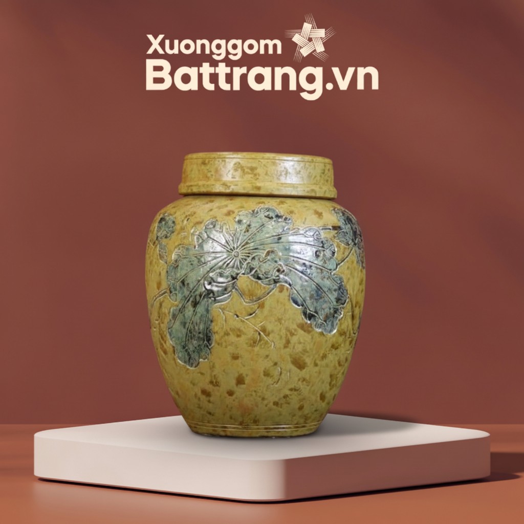 Mỗi chi tiết trên chum là minh chứng cho sự tài hoa và tâm huyết của người nghệ nhân Bát Tràng. Họa tiết lá sen được chạm nổi thủ công một cách tinh xảo, tạo độ sâu và sống động. Khác biệt với những sản phẩm công nghiệp, kỹ thuật này đảm bảo mỗi chiếc chum là một tác phẩm độc bản, mang dấu ấn riêng biệt.