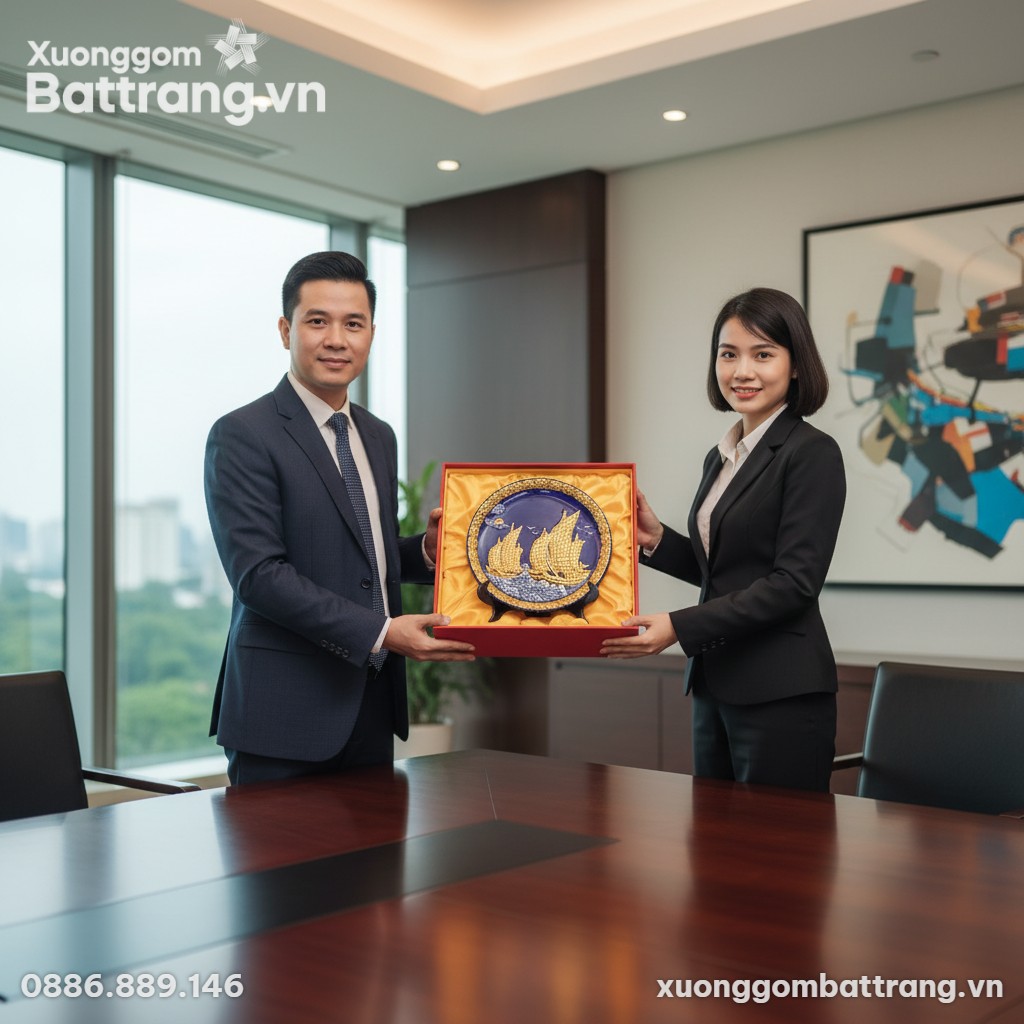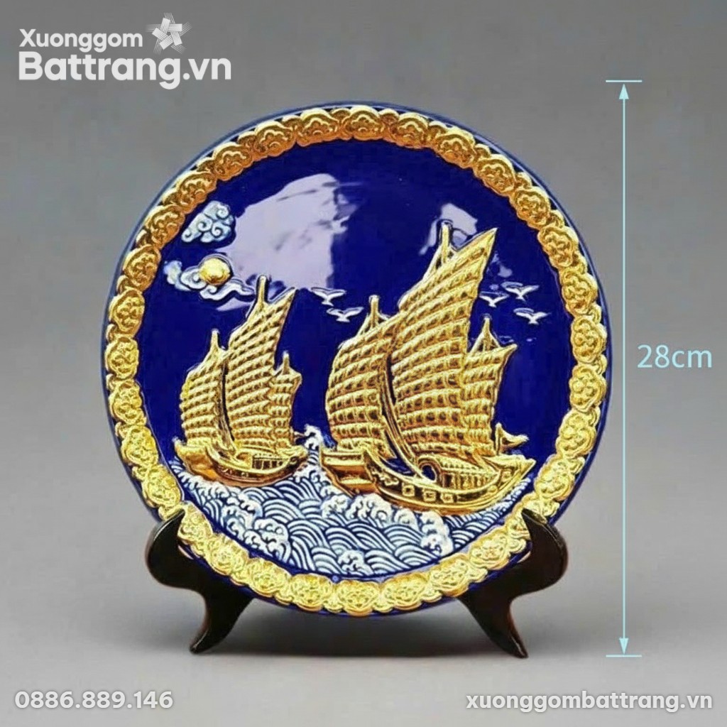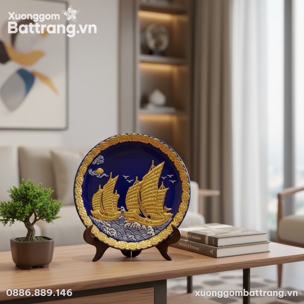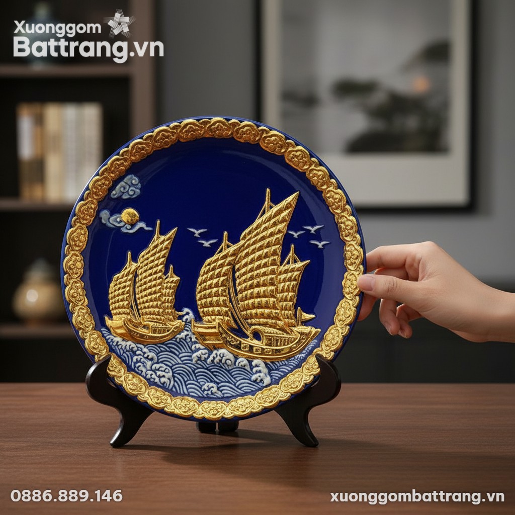 Với họa tiết “Thuận Buồm Xuôi Gió” được đắp nổi sống động và dát vàng 24K lấp lánh khtrên nền men xanh coban sâu thẳm, chiếc đĩa cảnh này xứng đáng là điểm nhấn đẳng cấp cho mọi không gian.