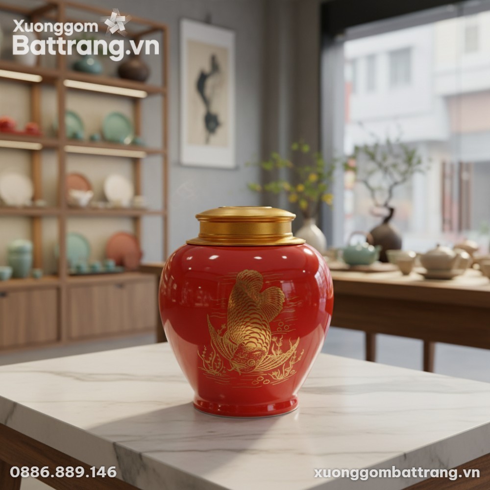 Trong dòng chảy của các vật phẩm hũ đựng trà cao cấp, những sản phẩm từ Bát Tràng luôn giữ vững vị thế của mình nhờ sự kết hợp hài hòa giữa kỹ thuật nung truyền thống và nghệ thuật trang trí hiện đại. Hộp Đựng Trà Họa Tiết Kim Long Men Đỏ XG-HDT10 là một minh chứng sống động cho điều đó.