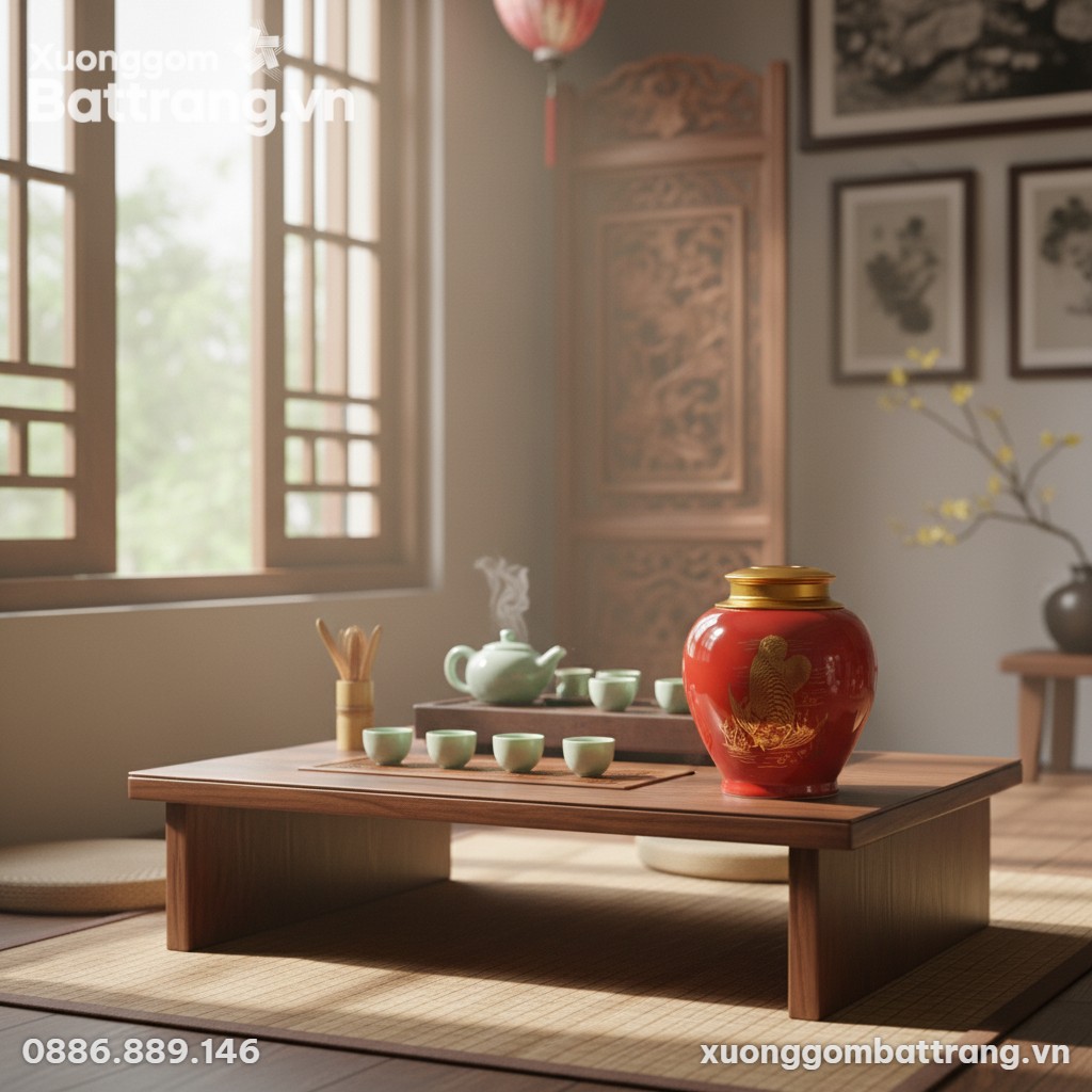 Hũ Trà Kim Long men đỏ được đặt trang trọng trong không gian phòng khách gia đình