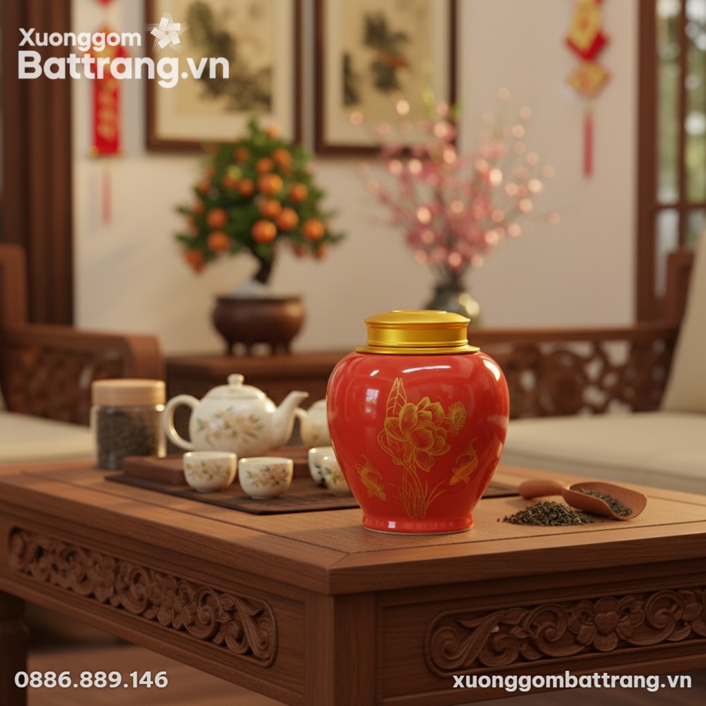 Hũ Đựng Trà Men Đỏ Nắp Vàng với họa tiết sen cá vàng kim rực rỡ, điểm nhấn cho không gian sang trọng.
