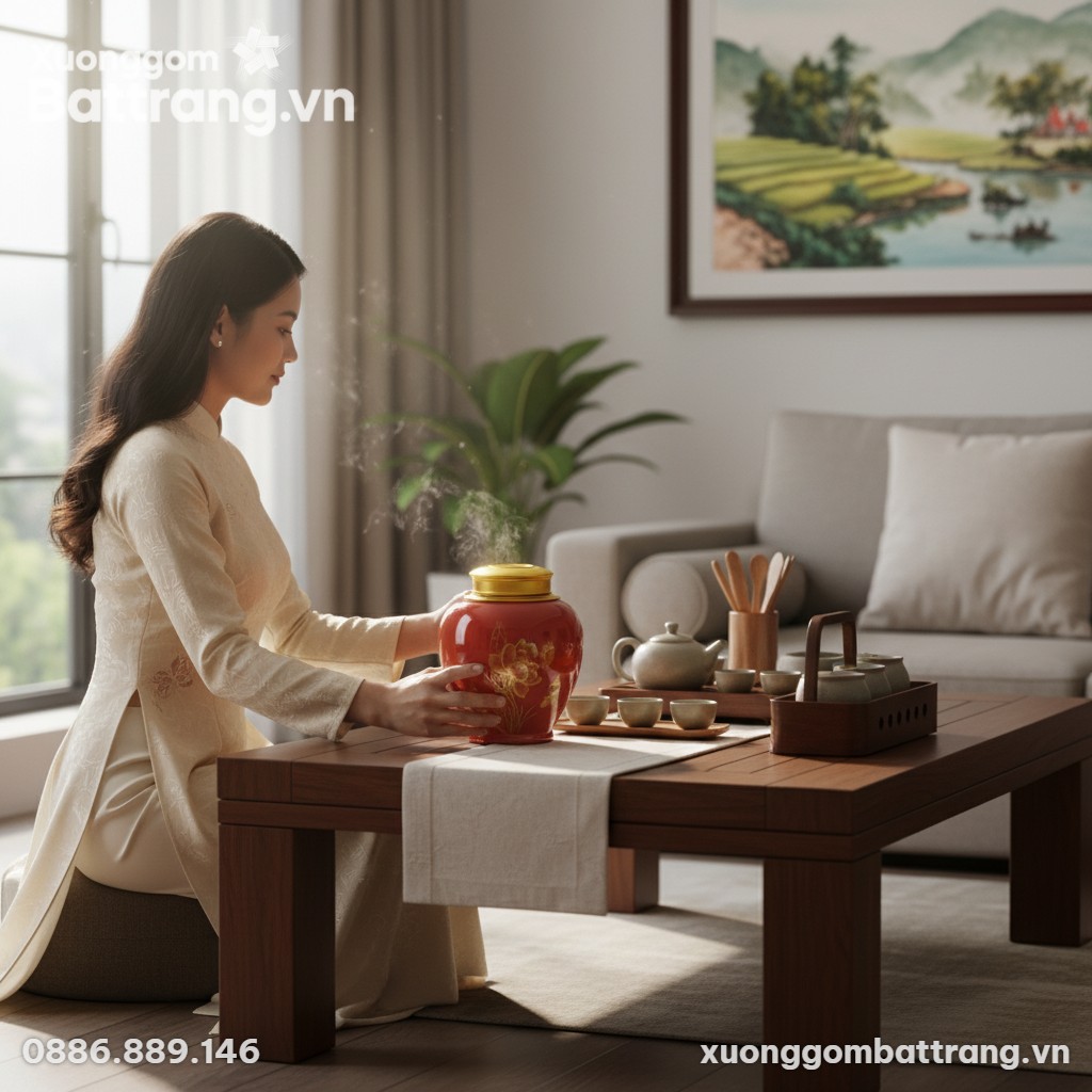 • Trang trí nội thất: Đặt hũ trà ở phòng khách, phòng trà, bàn làm việc hay phòng thờ để tạo điểm nhấn nghệ thuật, mang lại không khí ấm cúng và sang trọng.