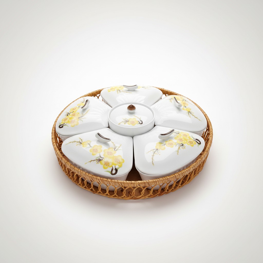 Khay Mứt Tết Gốm Sứ Hoa Mai Vàng Trong Giỏ Mây 6 Ngăn không chỉ là vật phẩm trang trí, mà còn là một tuyệt tác nghệ thuật mang đậm hơi thở truyền thống Việt, là biểu tượng của sự sum vầy và thịnh vượng trong mỗi dịp Tết đến xuân về. Sản phẩm là sự hòa quyện tinh tế giữa chất liệu gốm sứ Bát Tràng cao cấp và vẻ đẹp mộc mạc, gần gũi của giỏ mây tre đan, tạo nên một điểm nhấn khó quên trên bàn trà đón khách.