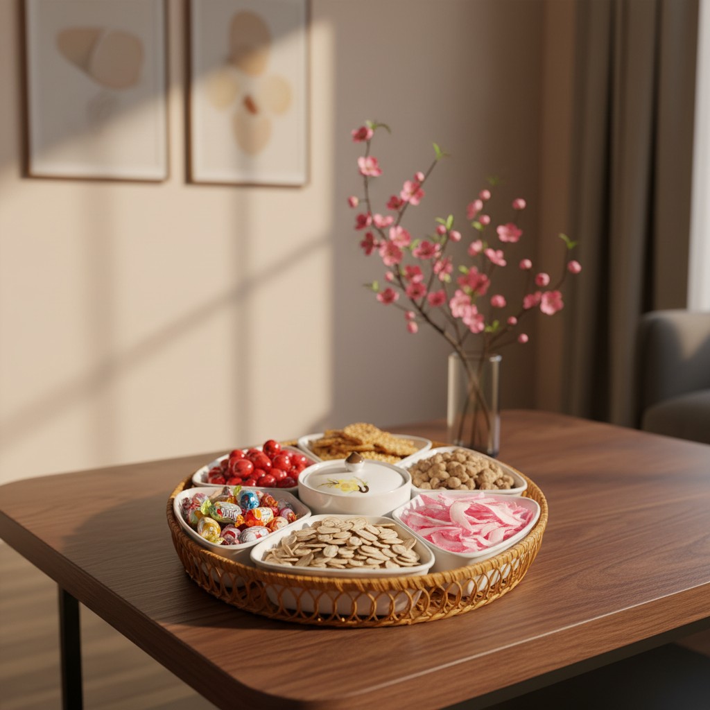 Khay mứt Tết này không chỉ đơn thuần là đồ dùng mà còn là trung tâm của mọi cuộc trò chuyện, là nơi những nụ cười và lời chúc tốt đẹp được sẻ chia. Nó là điểm nhấn tinh tế trên bàn trà, mời gọi mọi người cùng thưởng thức hương vị Tết và tận hưởng khoảnh khắc đoàn viên ấm áp.