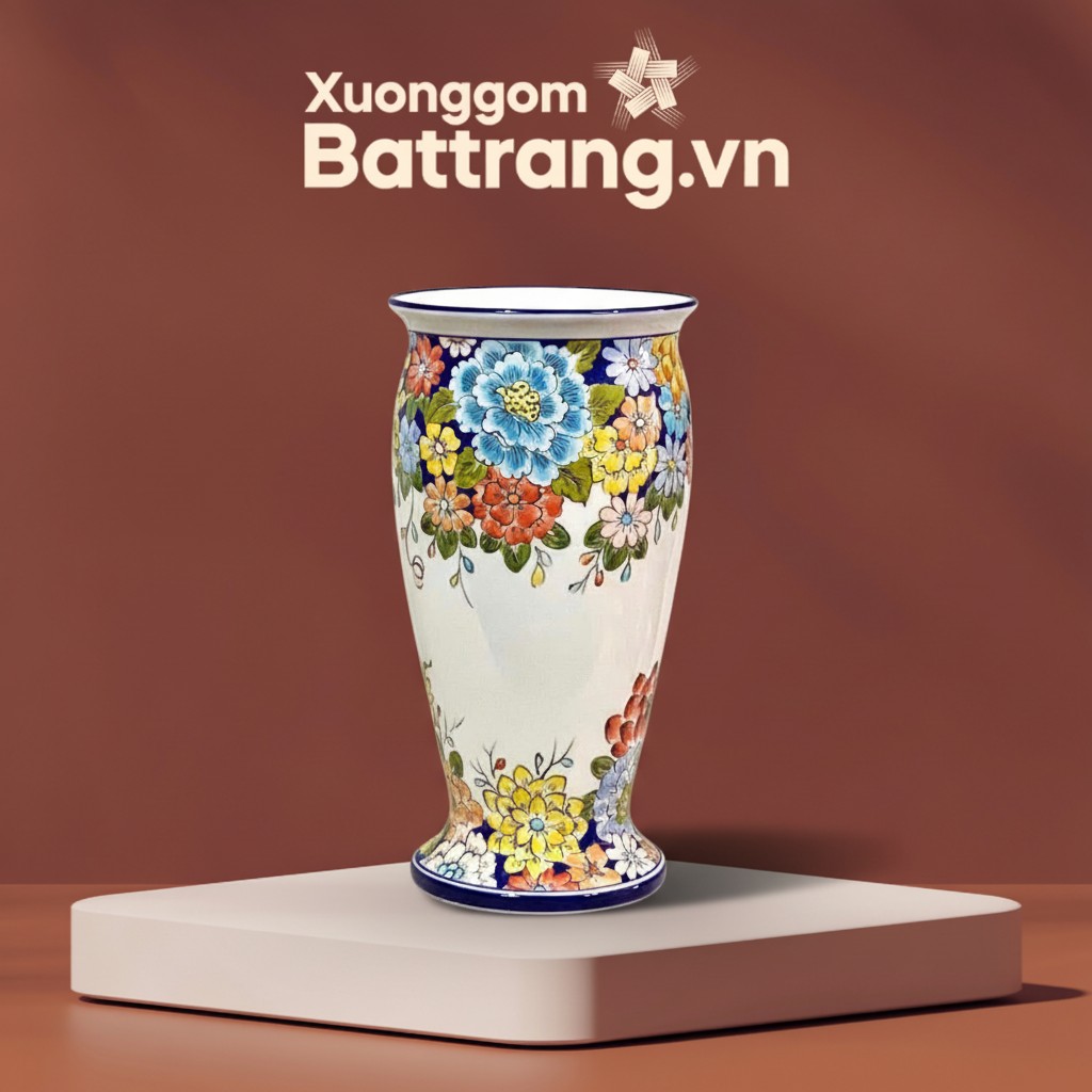 Mỗi bông hoa được vẽ một cách tỉ mỉ, với đường nét mềm mại và màu sắc tươi sáng, phản ánh sự khéo léo và tâm huyết của người thợ gốm. Đây chính là yếu tố tạo nên giá trị độc bản và nghệ thuật cho từng chiếc lọ hoa Bát Tràng. Nước men trắng bóng, cao cấp làm nổi bật các chi tiết vẽ tay, đồng thời giúp lọ hoa dễ dàng vệ sinh, giữ vẻ đẹp bền bỉ theo thời gian, tôn vinh giá trị của nghệ thuật thủ công.