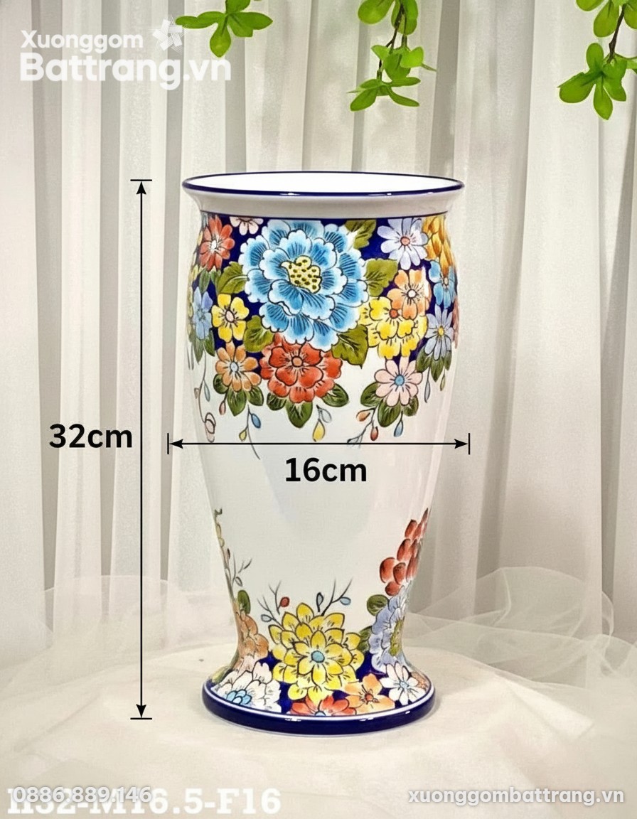 Chiếc lọ hoa này là minh chứng sống động cho tài hoa của những nghệ nhân tại Bát Tràng. Với chiều cao 32cm và đường kính 16cm, sản phẩm có kích thước lý tưởng để tạo điểm nhấn cho bất kỳ không gian nào.