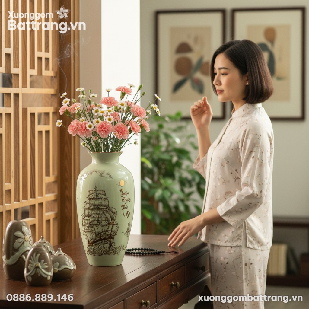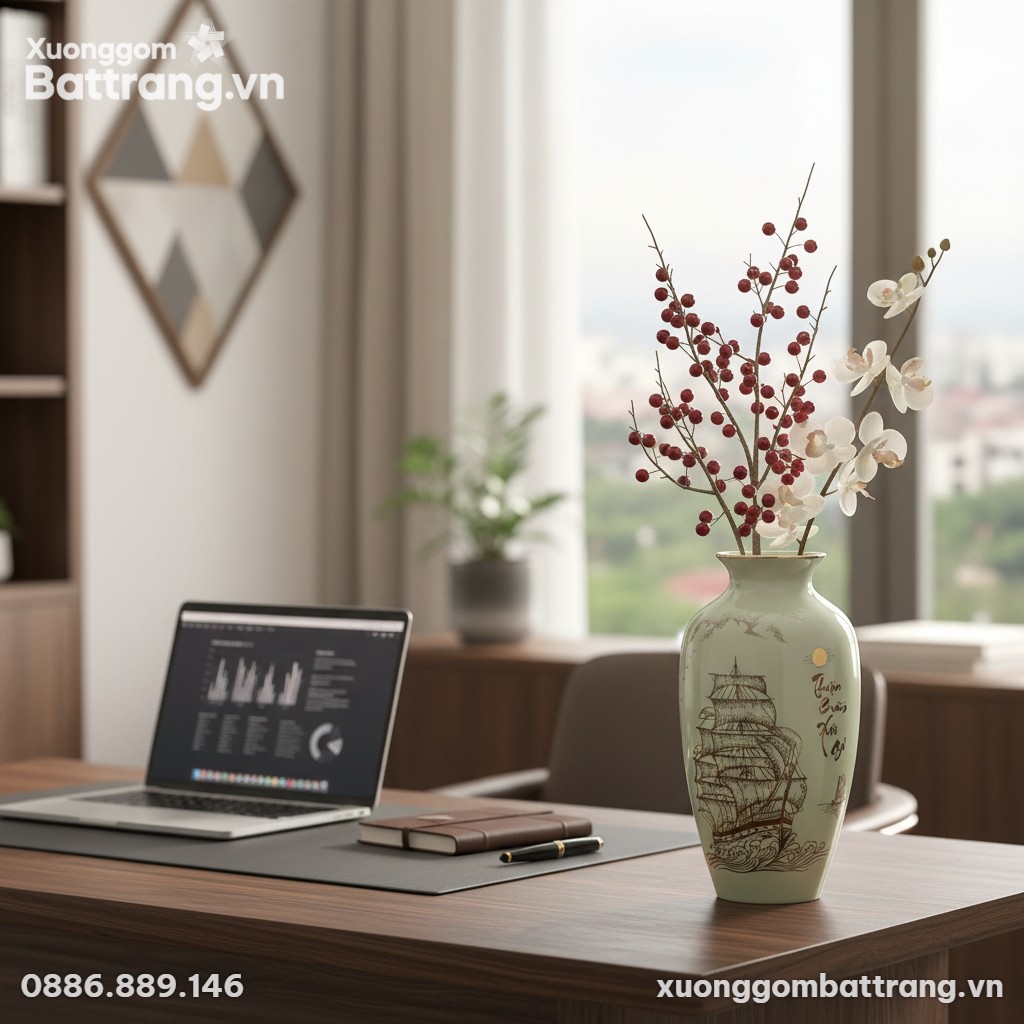Vượt lên vẻ đẹp hình thức, lọ hoa “Thuận Buồm Xuôi Gió” chứa đựng linh hồn và ý nghĩa phong thủy sâu sắc. Trong văn hóa Á Đông, thuyền buồm là biểu tượng mạnh mẽ của sự thuận lợi, suôn sẻ trong công việc, kinh doanh và cuộc sống. Họa tiết này gửi gắm ước vọng về một hành trình “xuôi chèo mát mái”, “gặp nhiều thuận lợi”, “ra khơi mang về tài lộc” và bình an cho gia chủ.