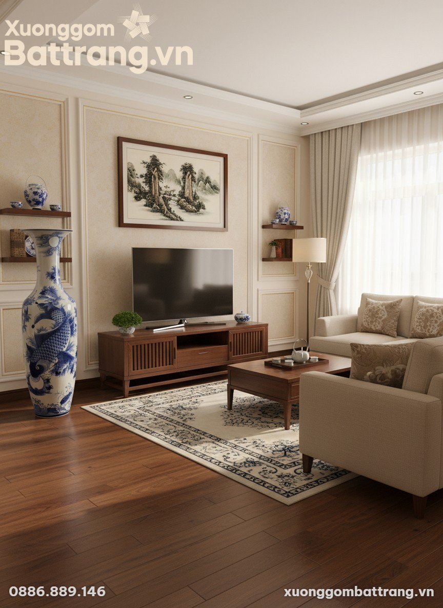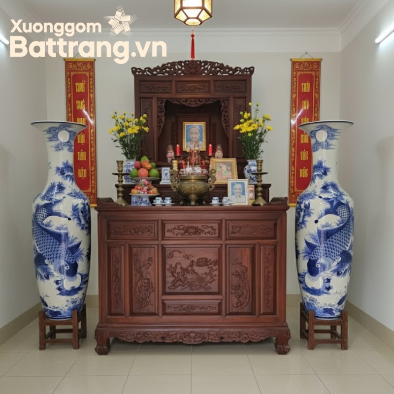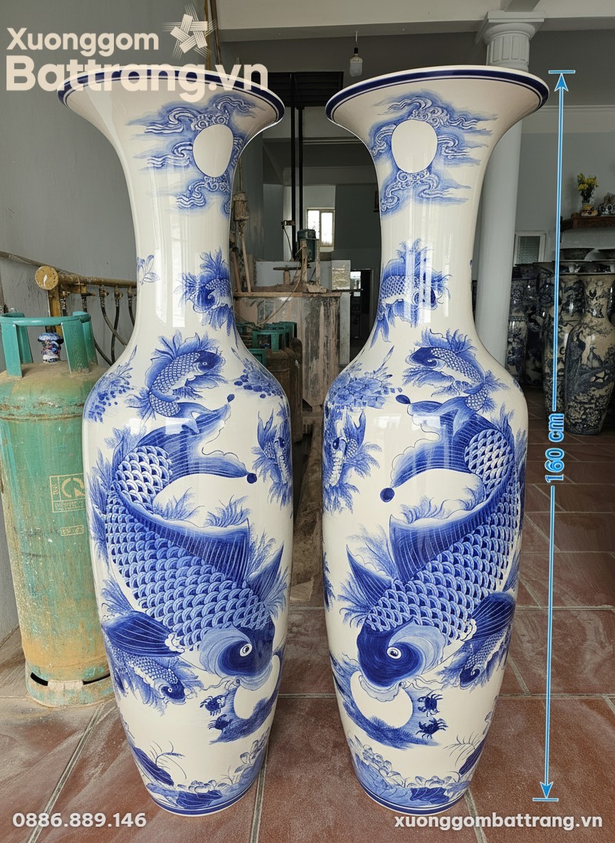 Đôi Lục Bình Men Lam Lý Ngư Chầu Nguyệt 1m6 là tuyệt tác gốm sứ Bát Tràng vẽ tay, mang ý nghĩa phong thủy sâu sắc về tài lộc, công danh. Với họa tiết cá chép vượt vũ môn và chất liệu cao cấp, sản phẩm là điểm nhấn sang trọng, thu hút vượng khí cho mọi không gian.