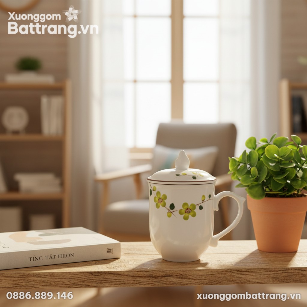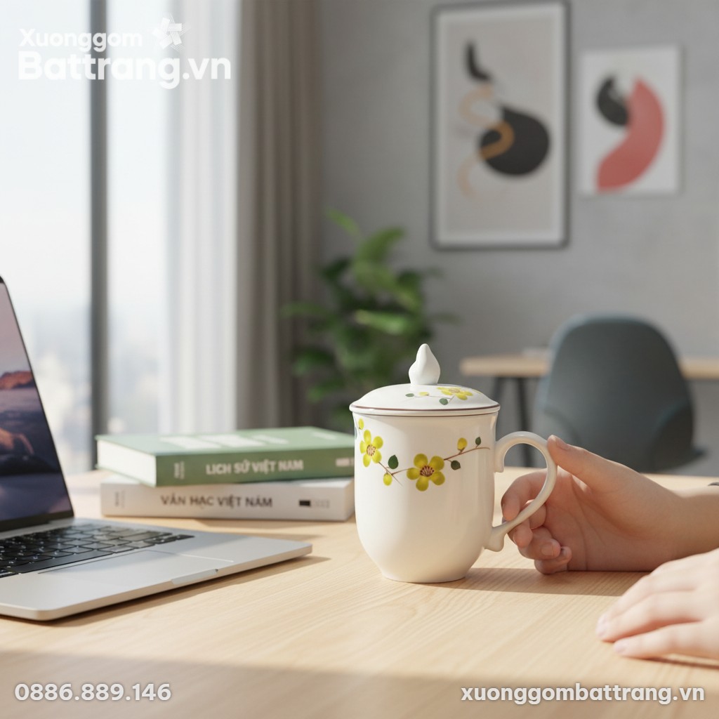 Cốc sứ có nắp đậy tiện dụng, tô điểm cho không gian làm việc