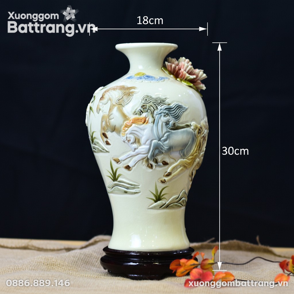 Mai Bình Tích Lộc Đắp Nổi Mã Đáo Thành Công Men Kem XG-MB01 là một tuyệt tác gốm sứ Bát Tràng, nơi tinh hoa nghệ thuật thủ công giao thoa cùng những giá trị phong thủy sâu sắc. Với dáng mai bình truyền thống, sản phẩm là điểm nhấn trang trí tinh tế, thể hiện rõ nét giá trị biểu tượng mạnh mẽ về tài lộc, sự nghiệp thăng tiến và phú quý bền vững.
