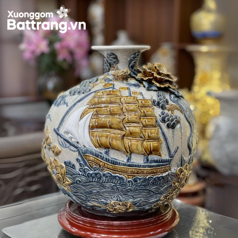 Bình hút lộc men kem rạn đắp nổi thuận buồm xuôi gió trang trí phong làm việc, phòng khách, quầy thu ngân