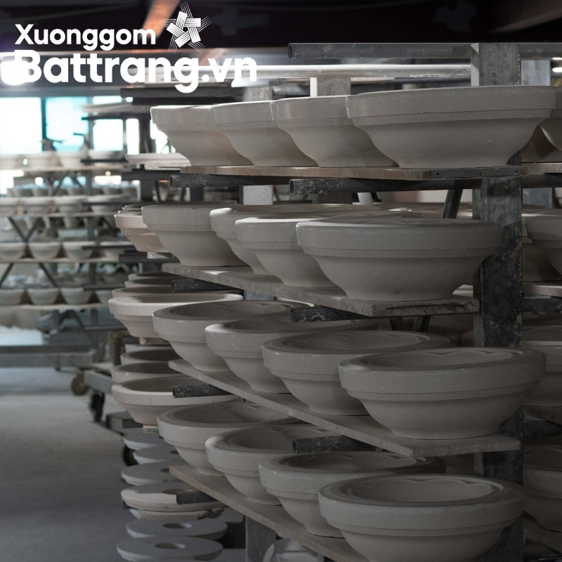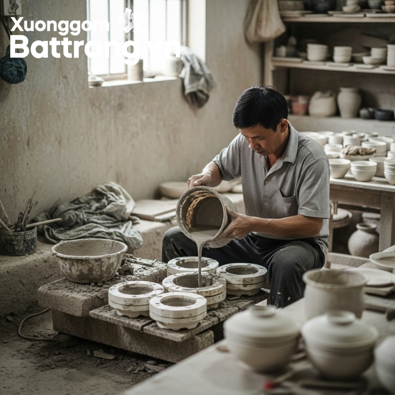 - Đổ rót khuôn thạch cao: Đối với các sản phẩm có độ sâu như bát, tô, đất sét lỏng được rót vào khuôn để định hình.