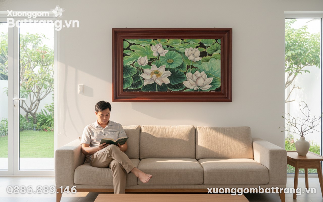 - Phòng khách: Treo tại vị trí trung tâm, phía sau sofa để tạo điểm nhấn nghệ thuật, thu hút ánh nhìn và mang lại sự thanh tịnh, yên bình cho ngôi nhà.